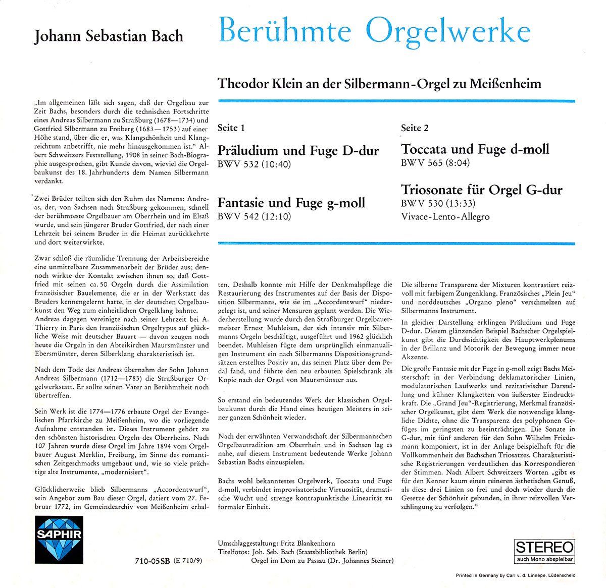 Der Organist Fernando Germani ist leider immer noch von Warner (welche EMI übernommen hat) kaum auf CD veröffentlicht - so auch keine der hier vorgestellten klanglich hervorragenden monauralen Bach Aufnahmen. Die Stereophonisierung der klanglich sehr guten französichen 4LP Box konnte wieder in ein klares Monosignal mit der ursprünglichen Akustik zurückgeführt werden.