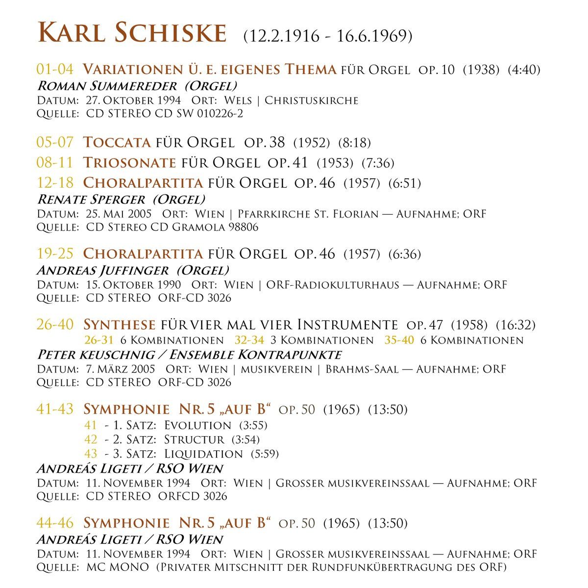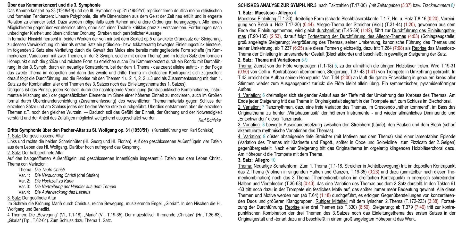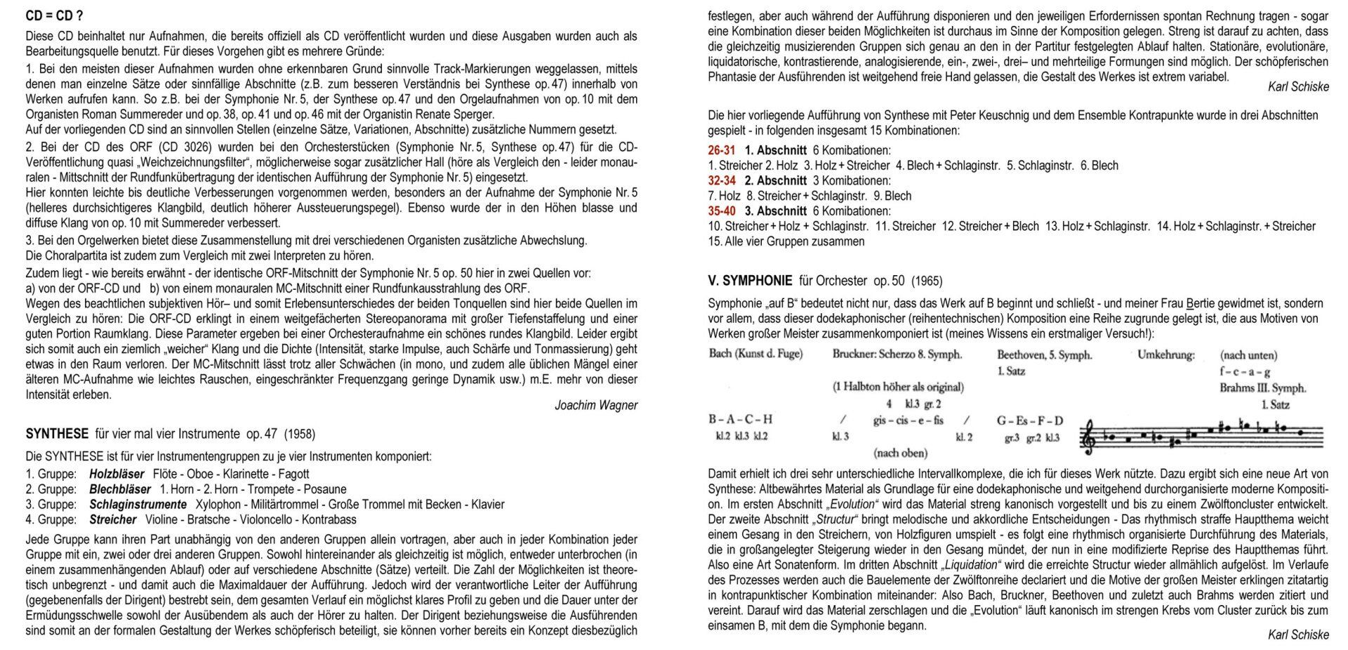 1. Bei den meisten dieser Aufnahmen wurden ohne erkennbaren Grund sinnvolle Track-Markierungen weggelassen, mittels denen man einzelne Sätze oder sinnfällige Abschnitte (z.B. zum besseren Verständnis bei Synthese op. 47) innerhalb von Werken aufrufen kann. So z.B. bei der Symphonie Nr. 5, der Synthese op. 47 und den Orgelaufnahmen von op. 10 mit dem Organisten Roman Summereder und op. 38, op. 41 und op. 46 mit der Organistin Renate Sperger.