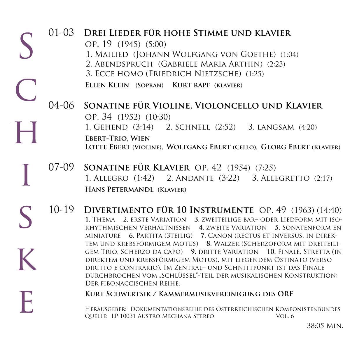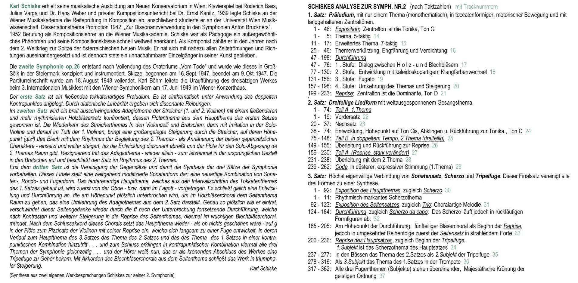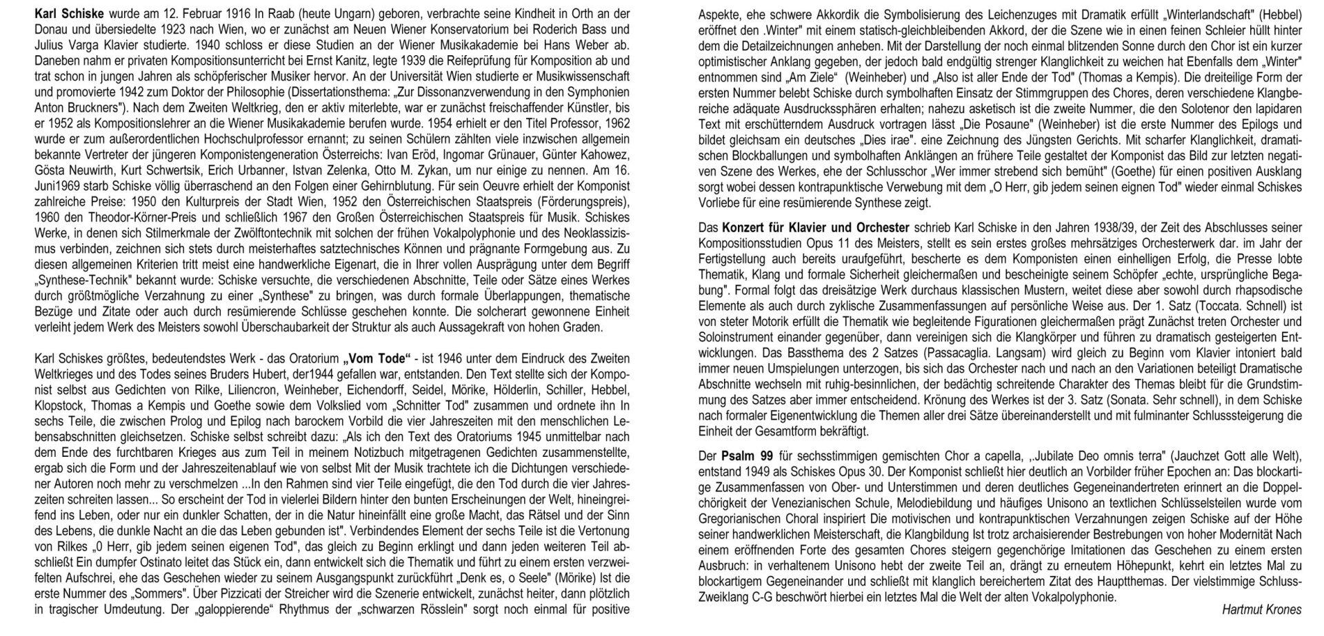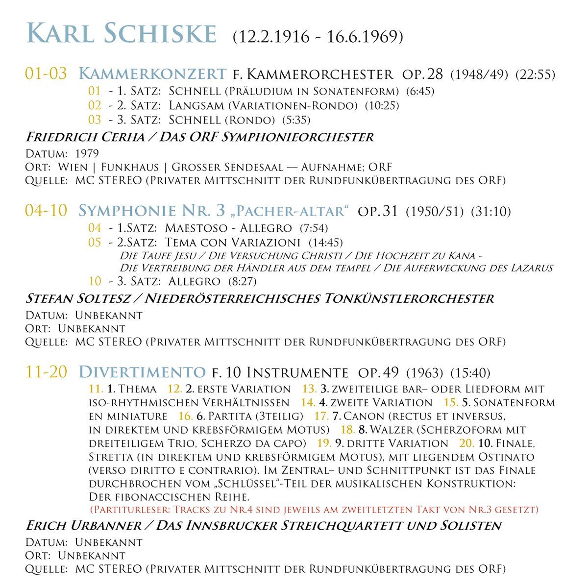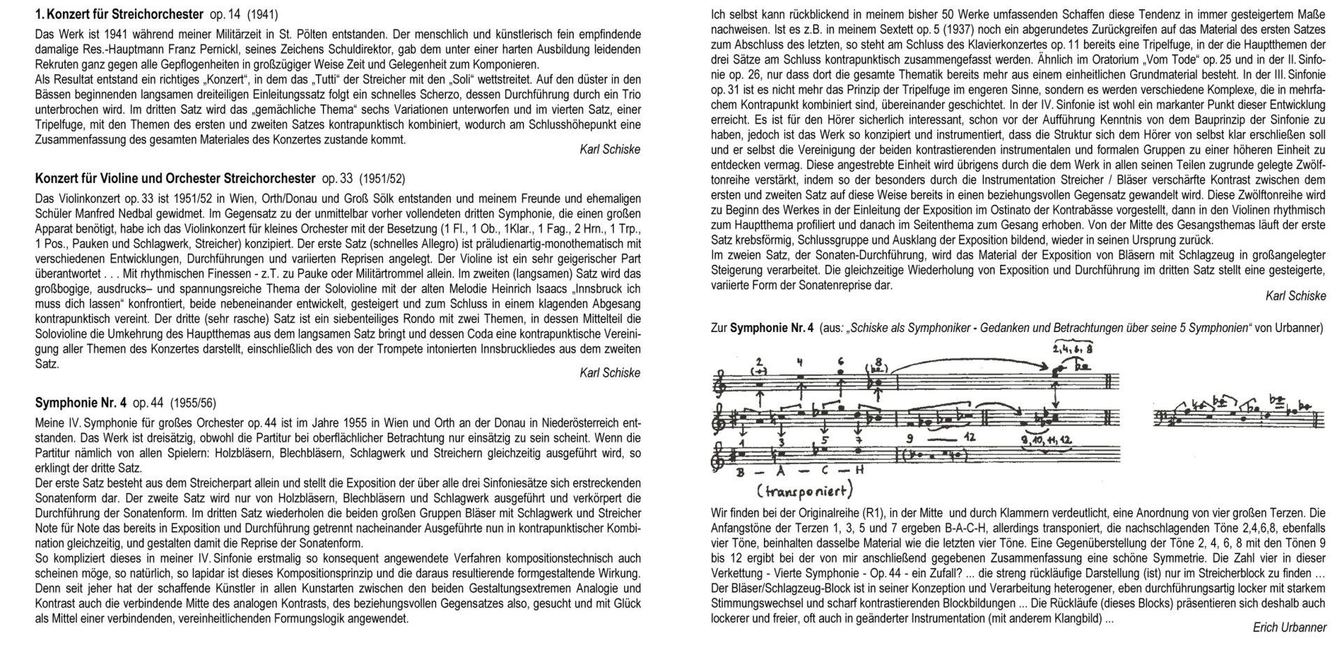 Für diese CD lag mir an noch unverarbeitetem Tonmaterial von Aufnahmen von Schiskes Werken nur noch ein privater Mitschnitt einer ORF-Übertragung der Symphonie Nr. 2 op. 26 in einer Aufführung mit Milan Horvat vor. Somit war für eine vollbespielte CD noch 45 Minuten Freiraum vorhanden. Die direkte Gegenüberstellung drei verschiedener Aufführungen des viertelstündigen Divertimentos op. 49 schien mir angesichts der herausragenden Bedeutung dieses wichtigen Werks des 20ten Jahrhunderts ein reizvoller Gedanke zu sein. Zudem ist die hier mit verwendete ORF-CD aus uneinsichtigen Gründen nur in einem Track produziert worden. Ich habe Tracknummern hinzugefügt und den Klang noch optimieren können. Und da ist der kräftige Kontrast zur 25 Jahre früher entstandenen zweiten Sinfonie: Op. 49 steht am Ende von Schiskes konsequenter Entwicklung, op. 26 zeigt die bereits meisterlichen Grundlagen dieses Wegs.