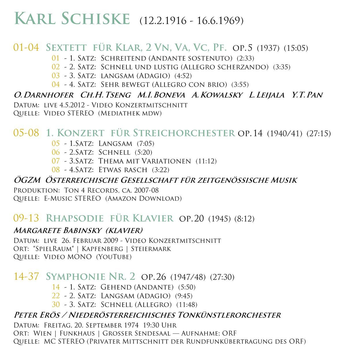 Auf acht CDs habe ich die gesamten mir zugänglichen Tonaufnahmen mit Werken von Karl Schiske zusammengestellt - mir selbst zu Freude und zu Demo-Zwecken. Vielleicht kann ich ja zur Verbreitung dieser wunderbaren Werke unter Musikern und bei Produzenten beitragen, sodass die Werke Karl Schiskes mehr aufgeführt und irgendwann hoffentlich auch endlich auf CD in Neuaufnahmen oder die Rundfunkaufzeichnungen als CD Produktionen erscheinen - und somit die Kompositionen dieses wichtigen österreichischen Komponisten weitere Verbreitung, Beachtung und Anerkennung finden. Mehr dazu finden Sie auf der Seite