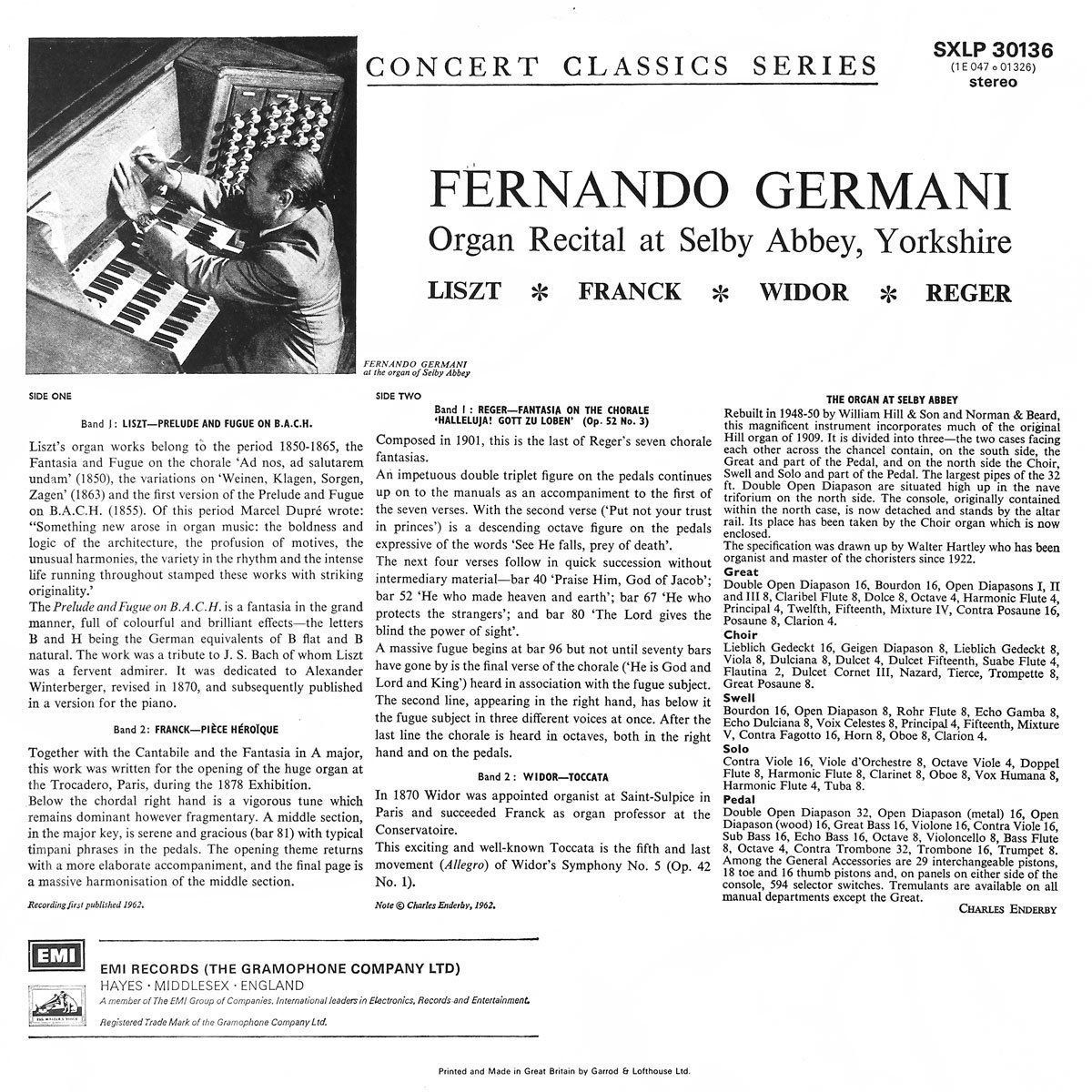 Der Organist Fernando Germani ist leider immer noch von Warner (welche EMI übernommen hat) kaum auf CD veröffentlicht, so auch keine der hier vorgestellten klanglich hervorragenden monauralen Bach Aufnahmen. Die Stereophonisierung der klanglich sehr guten französichen 4LP Box konnte wieder imn ein klares Monosignal mit der ursprünglichen Akustik zurückgeführt werden.
