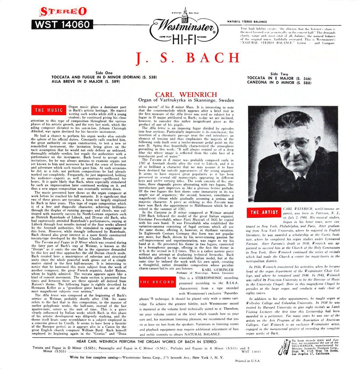 Carl Weinrich hat bei Westminster in Stereo das Orgelwerke Bachs eingespielt. Hier sind zwei dieser Stereo-LPs (WST 14043 + WST 14060) auf einer CD veröffentlicht. Klanglich ausgezeichnete Aufnahmen, die den einige Jahre später entstandenen RCA-Aufbahmen in nichts nachstehen. Zudem werden bei den Westminster-Aufnahmen historische Orgeln bespielt.