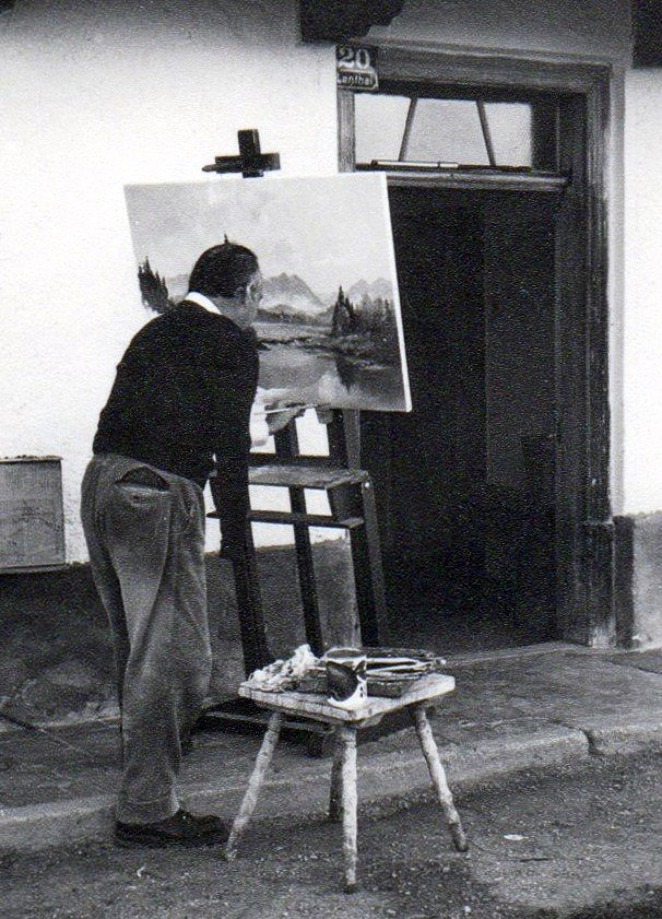 Otto Wagner bei der Arbeit mit einer stationären (Bild links) und einer tragbaren Staffelei (Bild oben). Auf die Verwendung einer üblichen Handfarbmischpalette muss der einarmiger Maler beim Malen "in der Plenäre" (nach französisch "en pleine" - im Freien) natürlich verzichten, aber ein Hocker tut den gleichen Dienst.