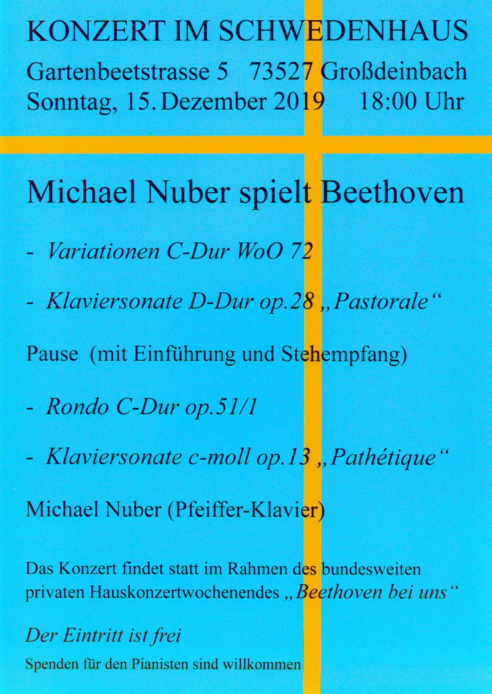 Der Schwäbisch Gmünder Konzertpianist Michael Nuber konnte gewonnen werden, ein reines Beethoven Programm mit vier Klavierkompositionen zu spielen, die aus der frühen und mittleren Schaffensperiode des Komponisten stammen.